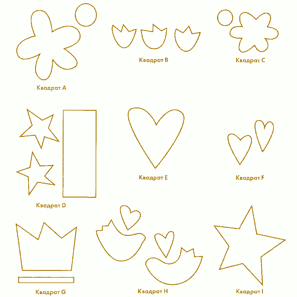 2. По центру квадратов А, Е, F и I приутюжьте четыре квадрата 3 х 3 см. К квадрату D приутюжьте прямоугольник. Проложите вдоль контуров квадратов и прямоугольника машинные строчки, отступив внутрь от края 0,2 см.