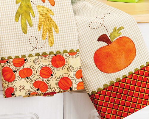 Кухонные полотенца с аппликацией тыквы и дубовых листьев и яркой кромкой.