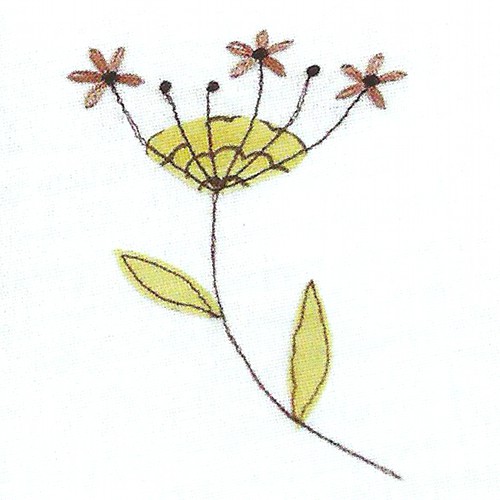 С помощью швейной машинки или швом *назад иглу* вышейте основной стебель и стебельки соцветия: машинным швом - в две строчки; швом* назад иглу* - нитью в два сложения. Листья обшейте по краю одинарной строчкой. Натяните салфетку на пяльцы. Шенильной иглой и мулине оттенка *шоколад* в шесть сложений вышейте по одному французскому узелку на кончике каждого стебелька соцветия. Вышивальной иглой и нитью оттенка *мокко* в три сложения вышейте на трех их них вокруг французского узелка лепестки швом *ленивая маргаритка*.