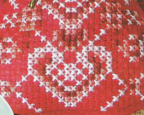 Вам понадобится: канва Аида красного цвета - 20x20 см ; мулине бледно-розового, персикового и темно-красного оттенков; наполнитель для игрушек; ленточка для подвешивания; бусина; ароматические специи .